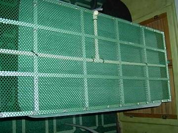 Podczas nitowania siatki starałem się ją jak najbardziej naciągnąć, aby się nie uginała pod obciążeniem żwiru, który będzie rozsypany na jej powierzchni. Niestety siatka zbyt się uginała nawet cztery wstawione kątowniki poprzecznie nie zapobiegły temu w wystarczającym stopniu, musiałem dodatkowo pod siatkę (na kątowniki) wsunąć i przynitować alu płaskowniki, które zapobiegły nadmiernemu uginaniu się siatki i jeszcze bardziej usztywniły całość.